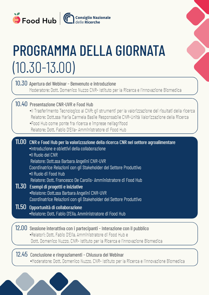 Webinar di Presentazione del Memorandum of Understanding (MoU) tra l’Unità Valorizzazione della Ricerca del CNR e Food Hub Srl Società Benefit