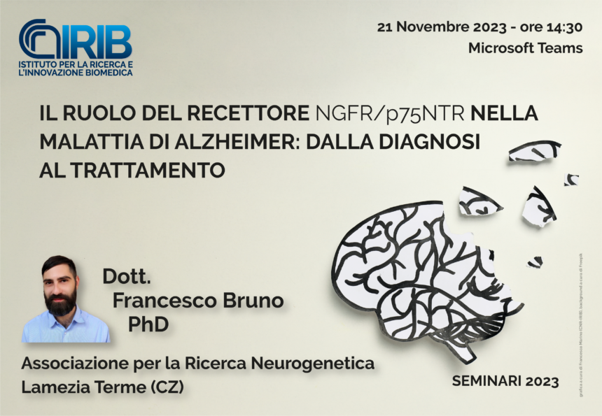 La malattia di Alzheimer rappresenta la più diffusa forma di demenza ed è caratterizzata principalmente dall’accumulo cerebrale di beta-amiloide (Aβ) nello spazio extracellulare (placche amiloidi) e da depositi intracellulari formati soprattutto dalla forma iperfosforilata della proteina tau (p-tau; grovigli o aggregati neurofibrillari). NGFR/p75NTR rappresenta un recettore a simile affinità per tutte le neurotrofine (proNGF, NGF, BDNF, NT-3 e NT-4/5) ed è coinvolto in pathway molecolari che determinano sia la sopravvivenza e morte dei neuroni. Una più recente linea di ricerca indica che anche il peptide Aβ è in grado di legarsi a questo recettore, rendendolo il candidato “ideale” nella mediazione della neuropatologia indotta da Aβ. Oltre che nella patogenesi e nella neuropatologia, diversi dati indicano che NGFR/p75NTR potrebbe svolgere un ruolo chiave nella Malattia di Alzheimer anche da un punto di vista genetico. Altri studi, infine, hanno suggerito che NGFR/p75NTR potrebbe rappresentare un promettente biomarker diagnostico e bersaglio terapeutico per questa forma di demenza. Nel presente seminario verranno illustrate tutte le evidenze scientifiche che rendono NGFR/p75NTR “l’anello mancante” della Malattia di Alzheimer.