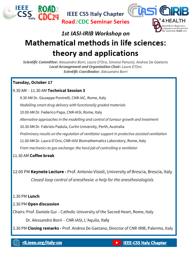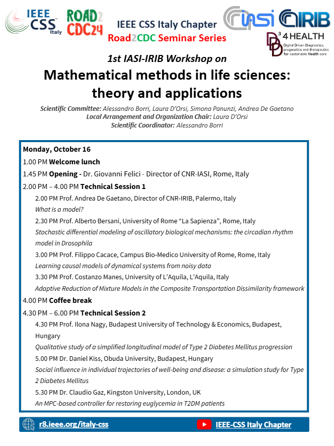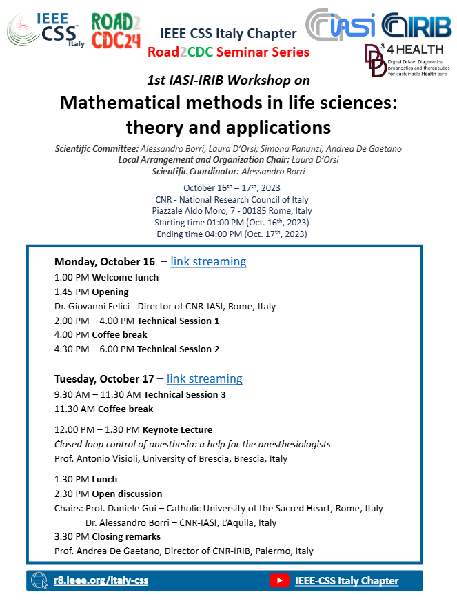 Il workshop si terrà presso la sede centrale del CNR, di cui ricorrono quest’anno le celebrazioni per il centenario dalla nascita (1923), e sarà trasmesso in streaming nell’ambito dell’iniziativa “Road2CDC”, promossa dal Chapter italiano della IEEE Control Systems Society.