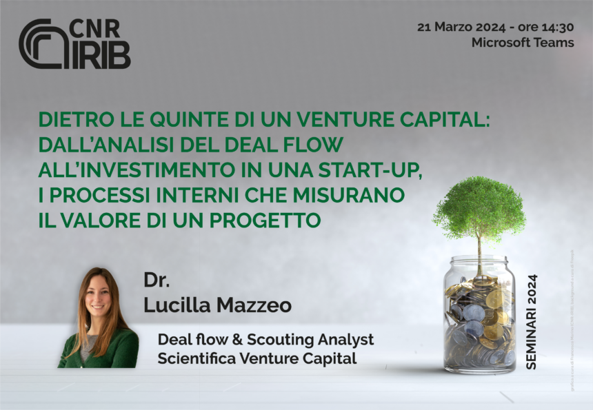 Il webinar si propone di offrire una panoramica sul funzionamento di un venture capital, partendo dall’analisi del flusso delle opportunità di finanziamento fino all’investimento effettivo in una start-up. La presentazione si concentrerà principalmente sui processi interni che valutano il valore di un progetto, offrendo un’analisi delle metodologie e delle strategie d’investimento utilizzate.